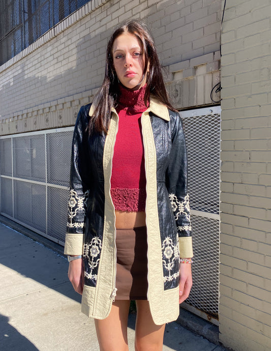 Vtg Nanette Lepore Black & Cream Detail Leather Trench