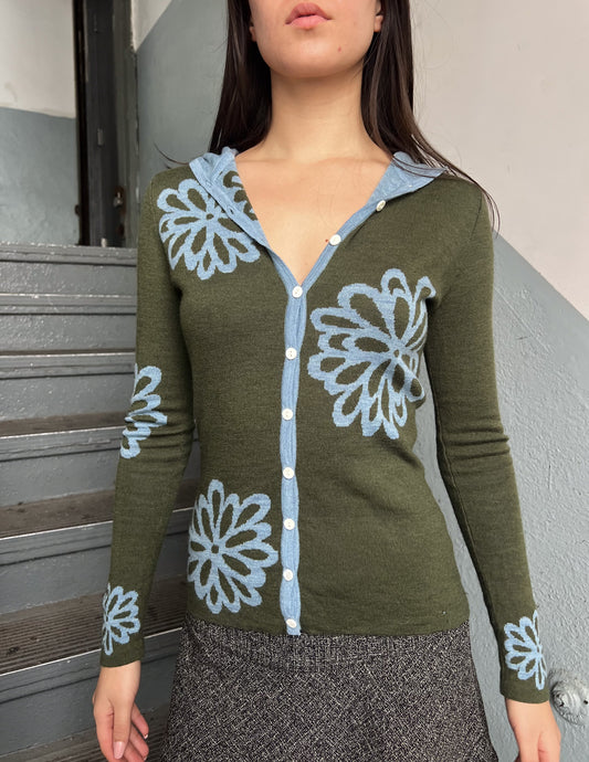 Blue & Green Floral Hooded Merino Wool Cardigan