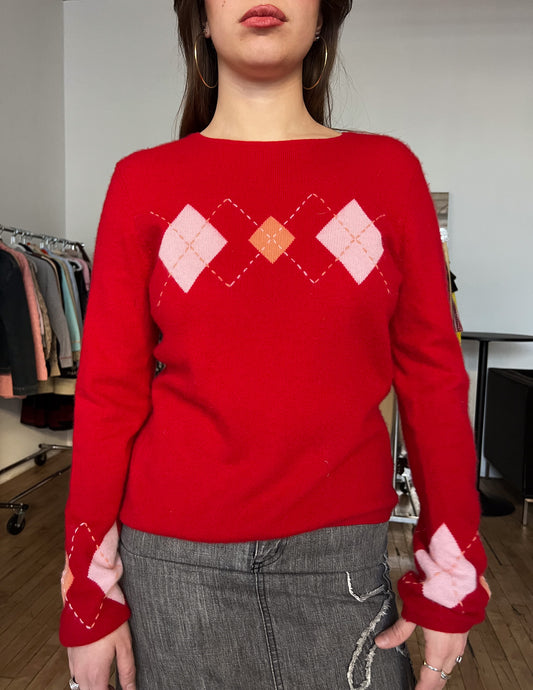 Vtg 100% Cashmere Red & Pink Argyle Sweater