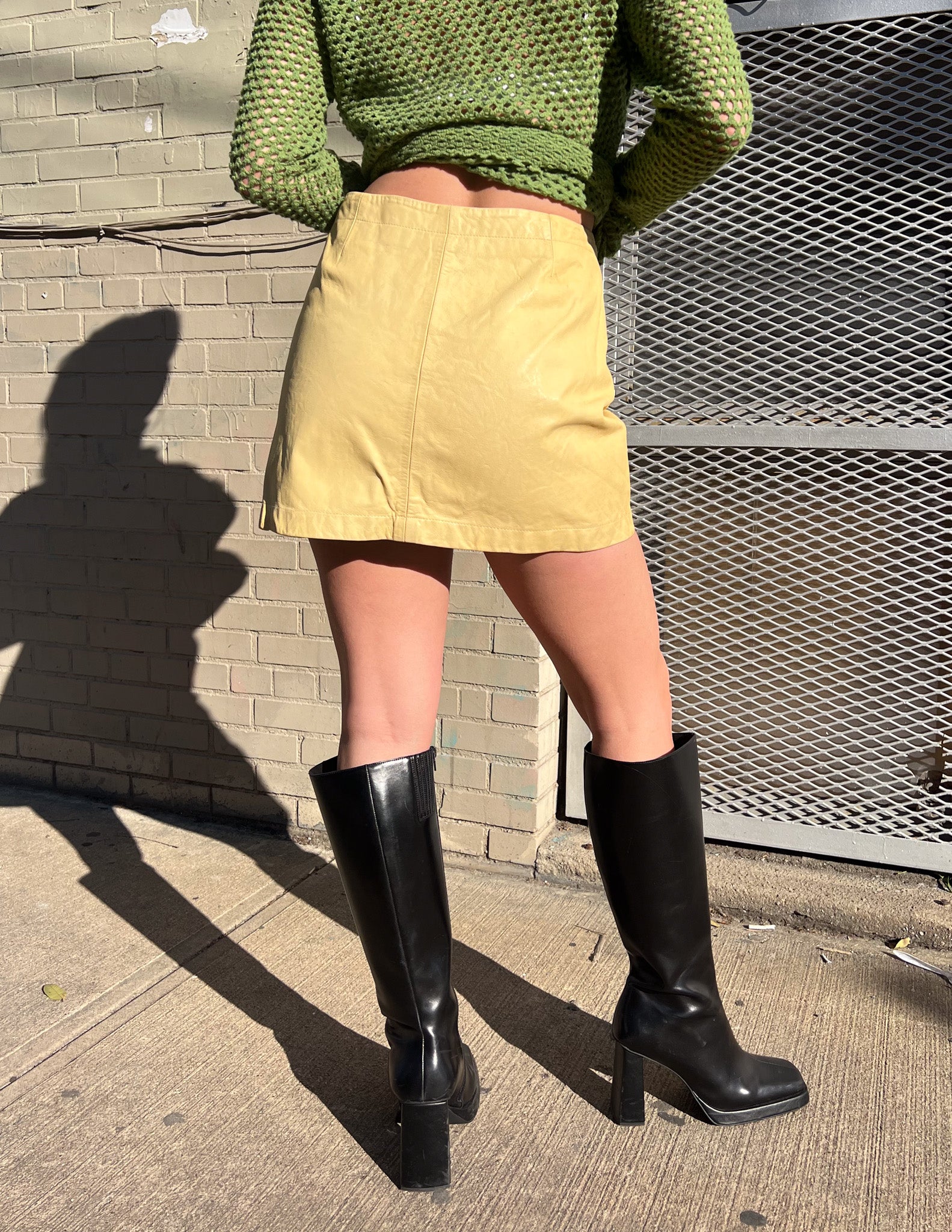 Maya is wearing a DKNY 100% Leather Butter Yellow Mini. This skirt would be best fit for size XS-M.