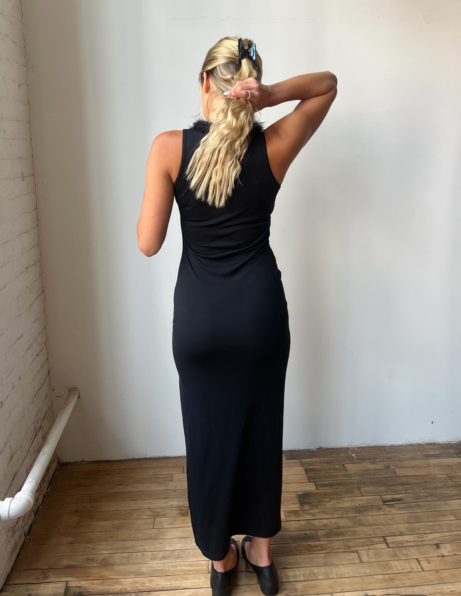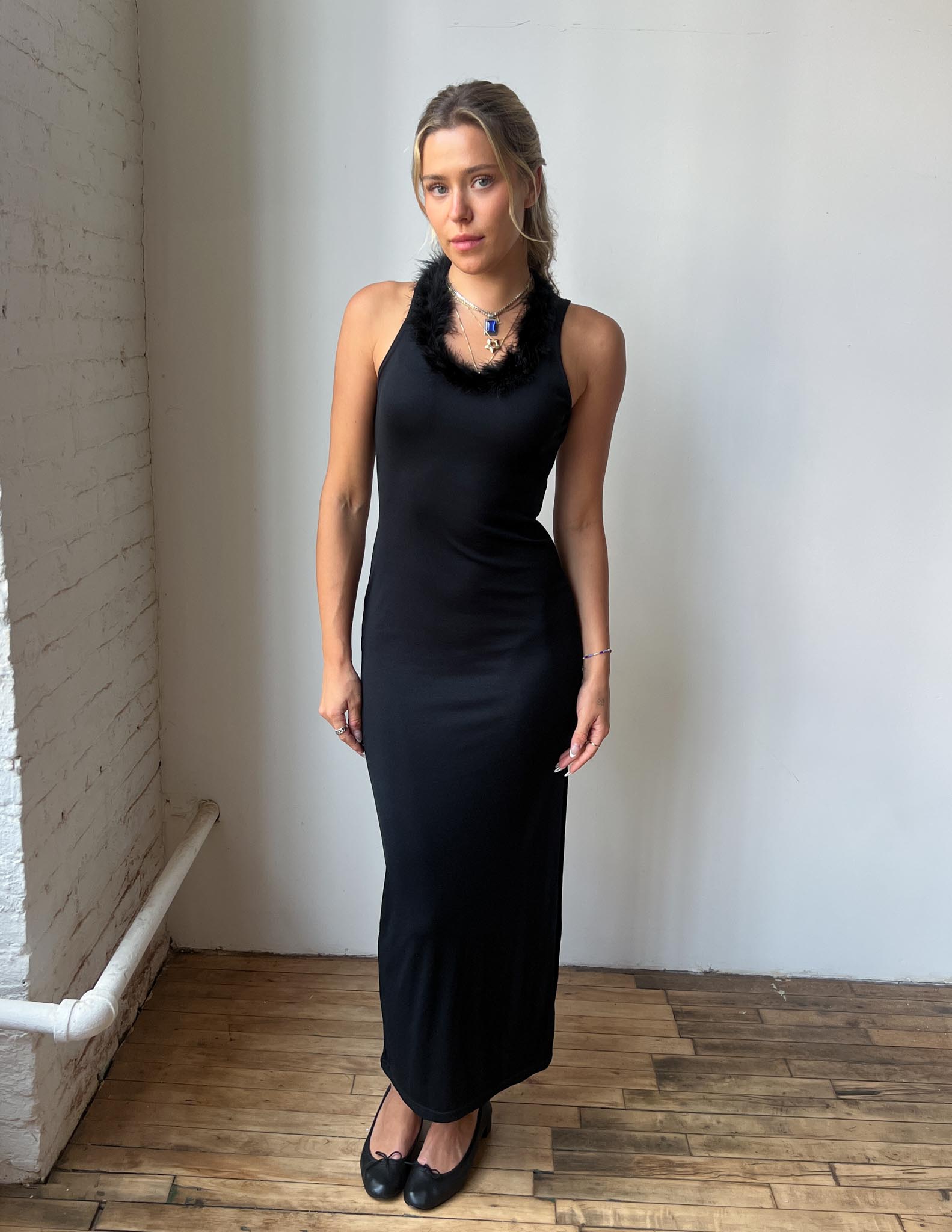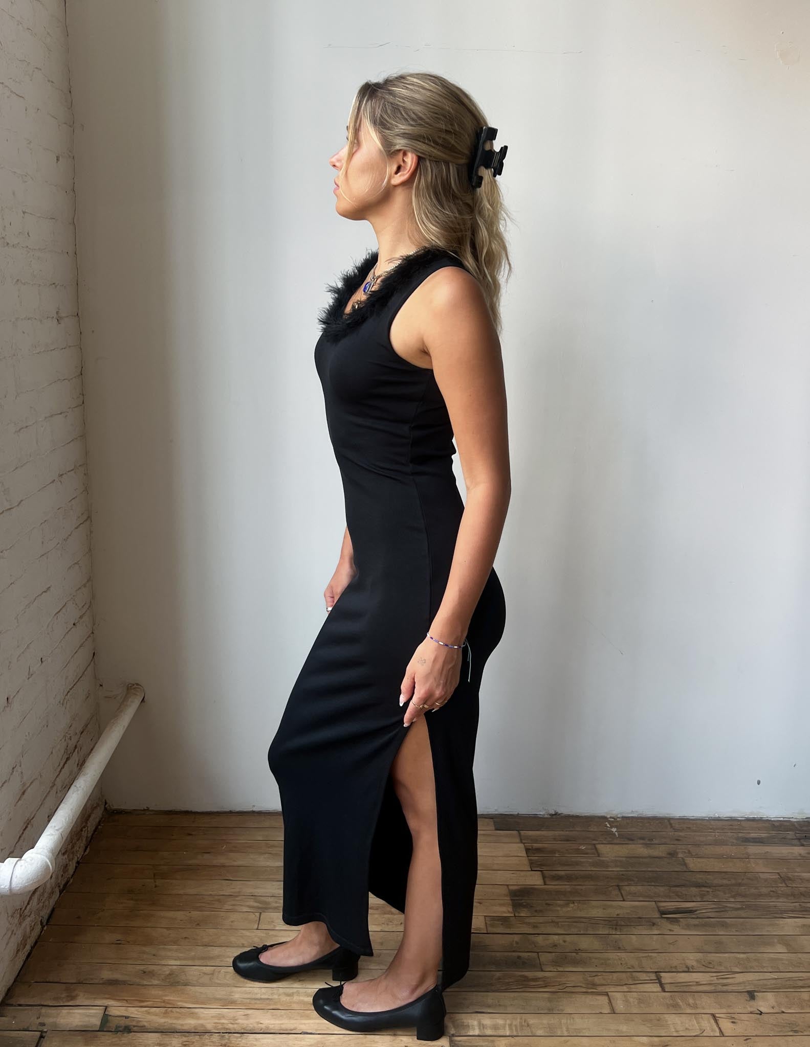 Natalia is wearing a 90s Black Dress Fur Collar High Slit. This dress would be best fit for size S.