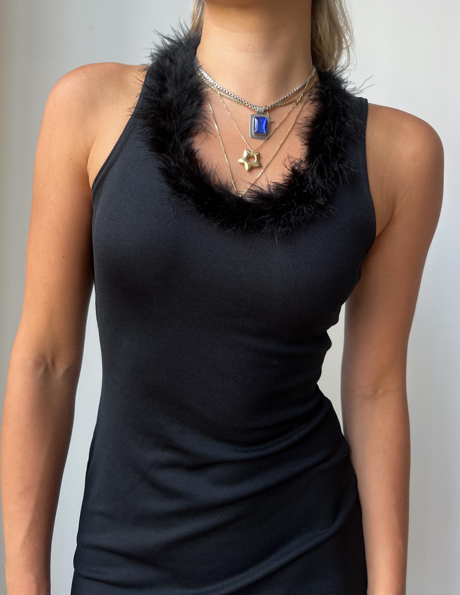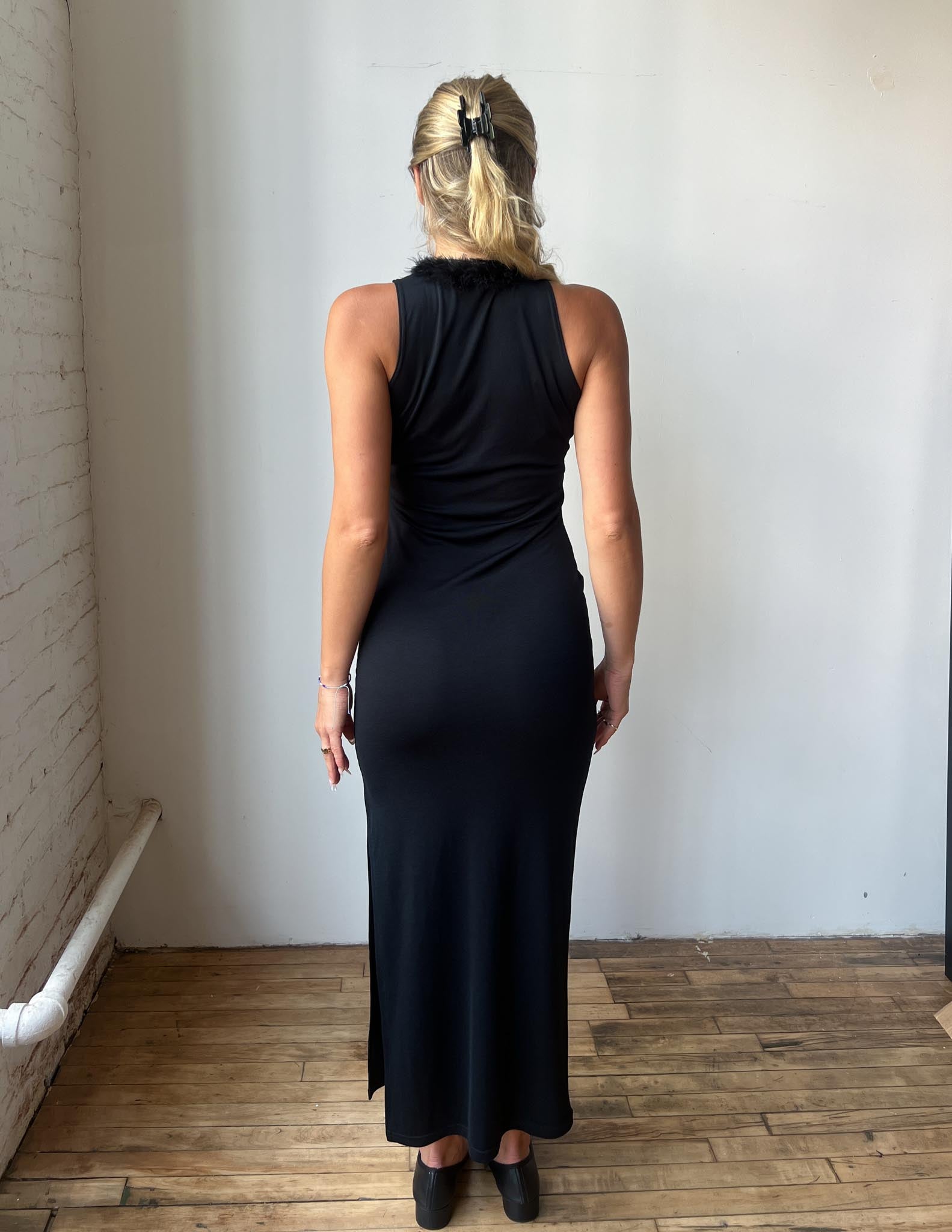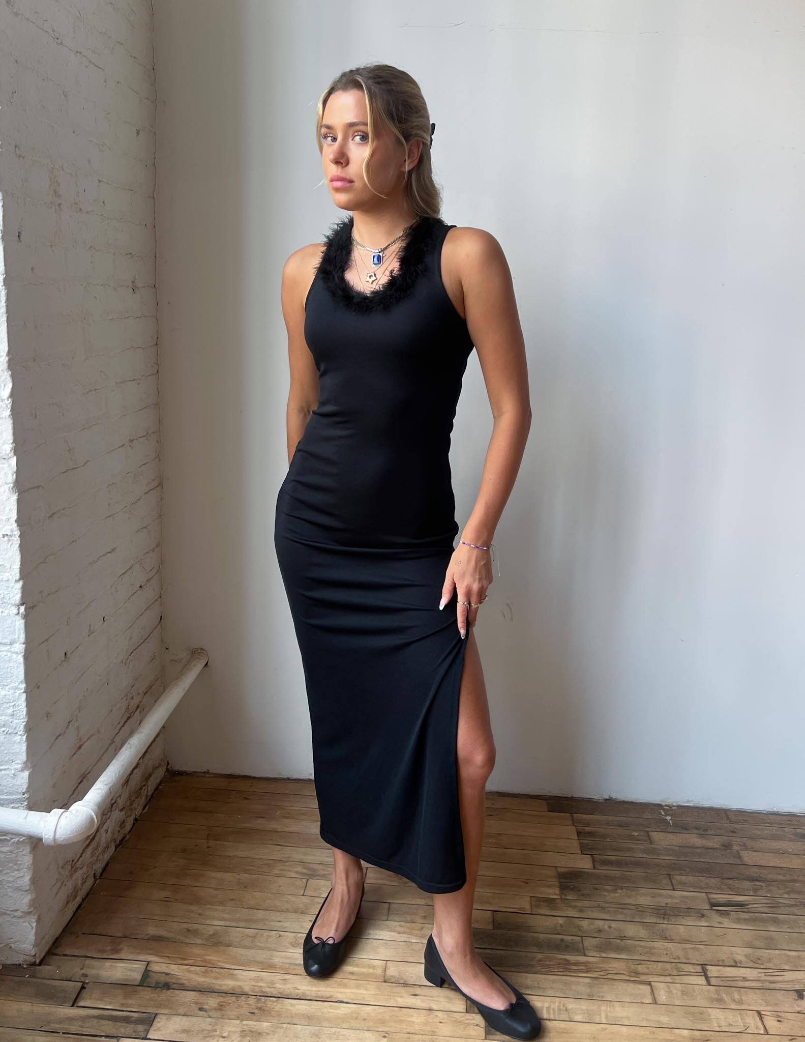 Natalia is wearing a 90s Black Dress Fur Collar High Slit. This dress would be best fit for size S.