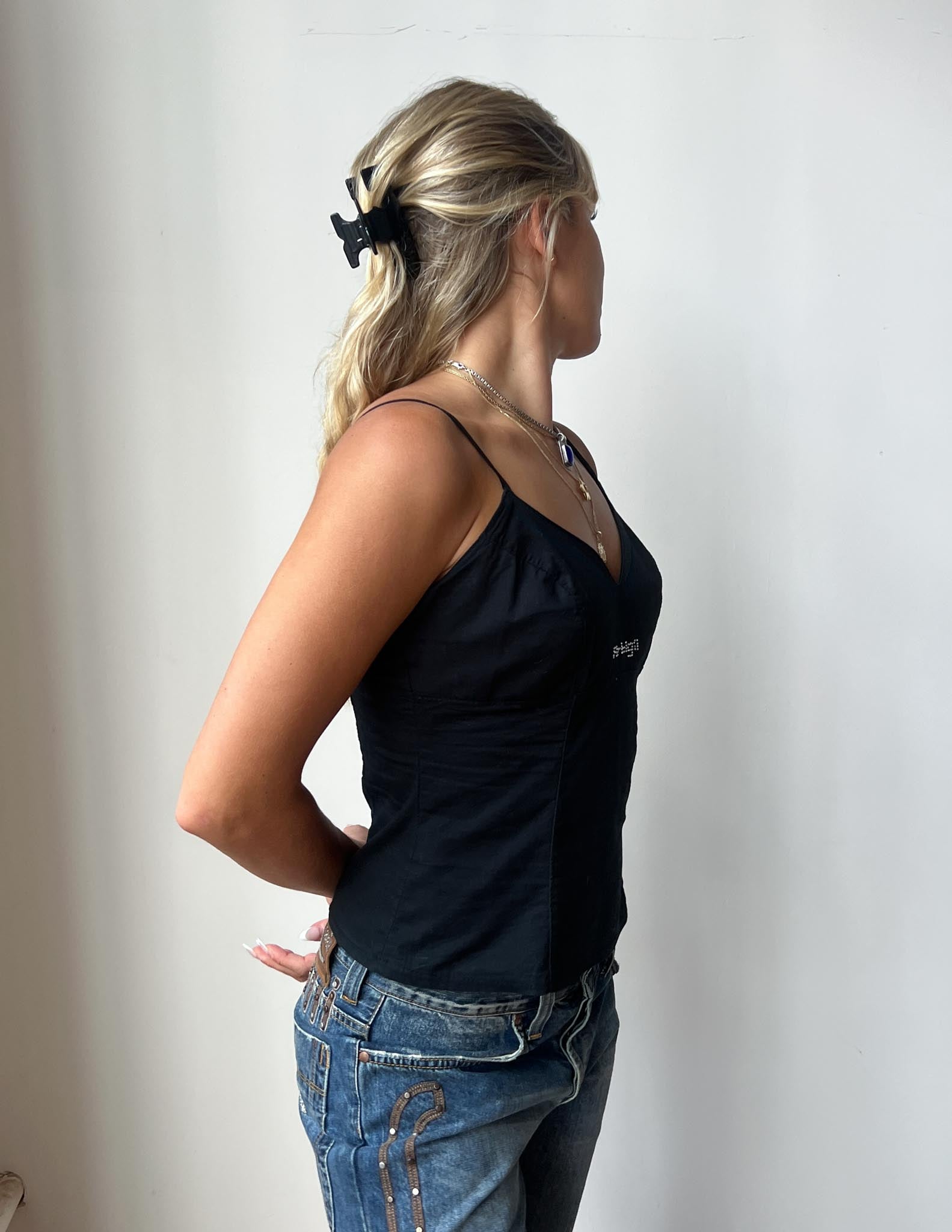 Natalia is wearing a Black Cotton Rhinestone Bustier. This top would be best fit for size M.