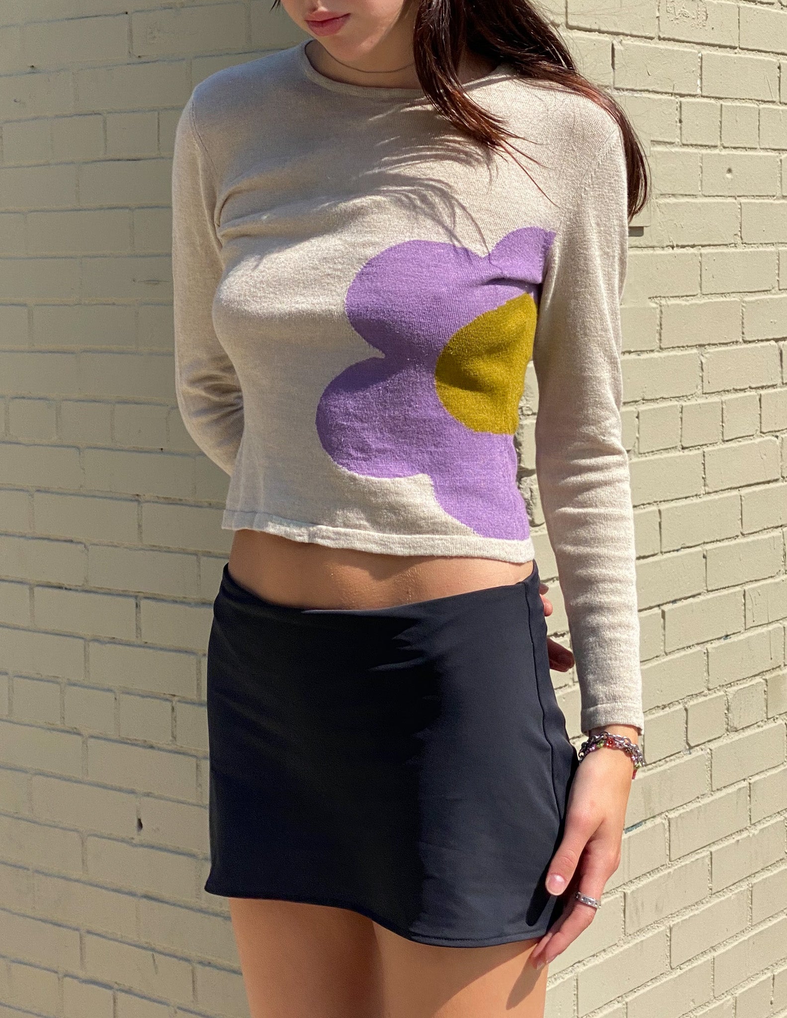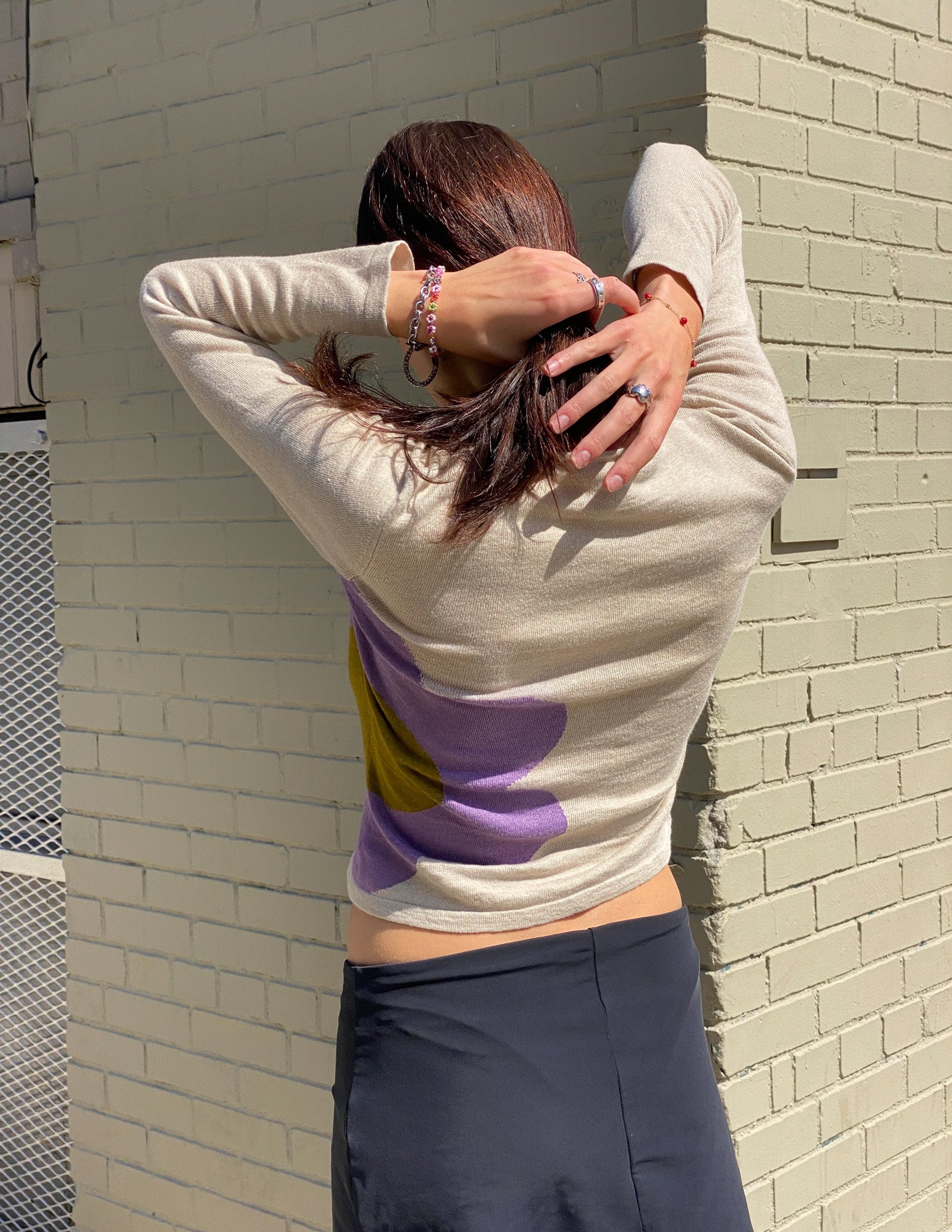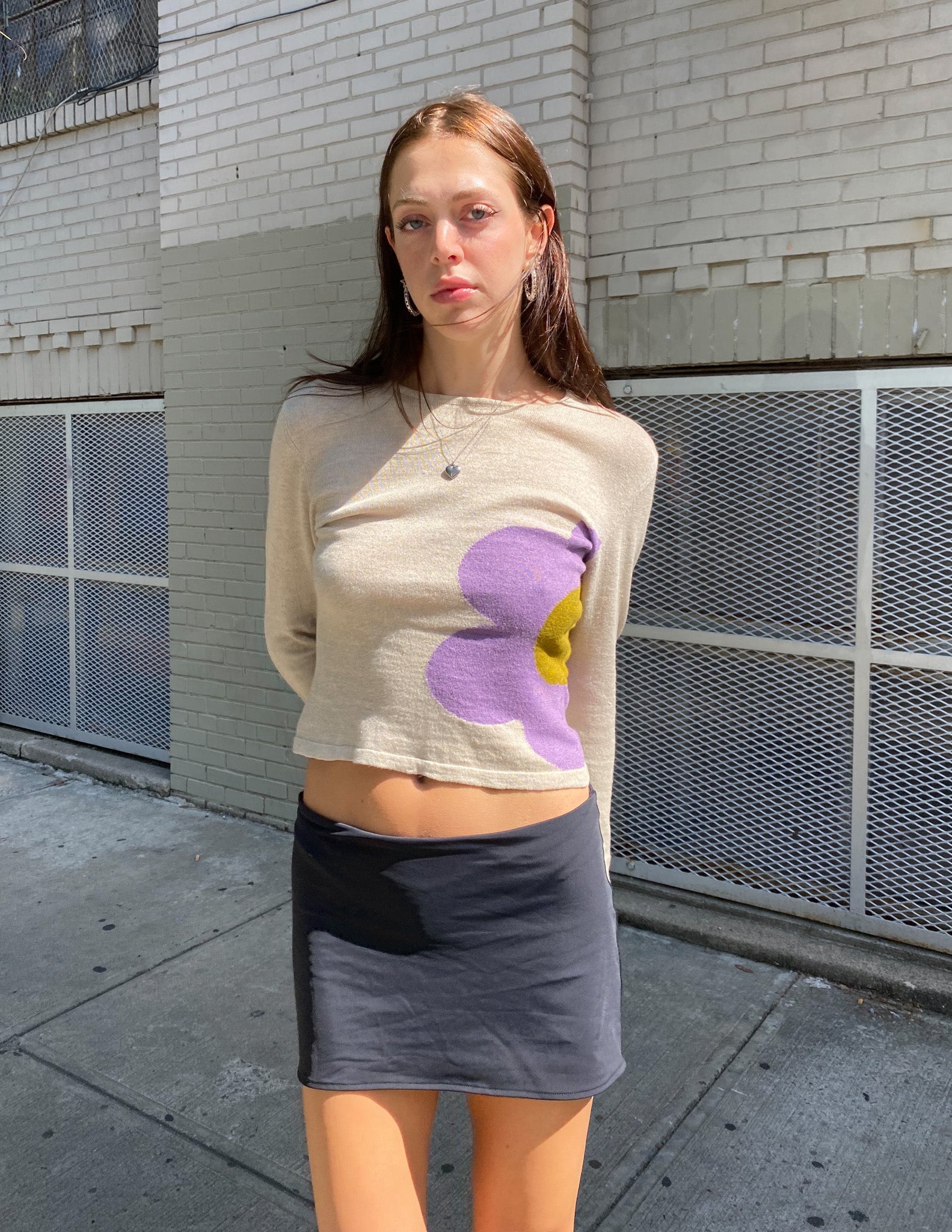 Caty is wearing a Celine Linen Blend Floral Sweater. This sweater would be best fit for size S.