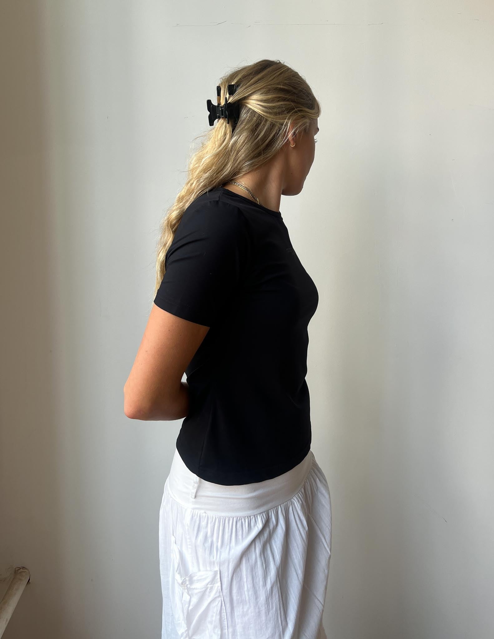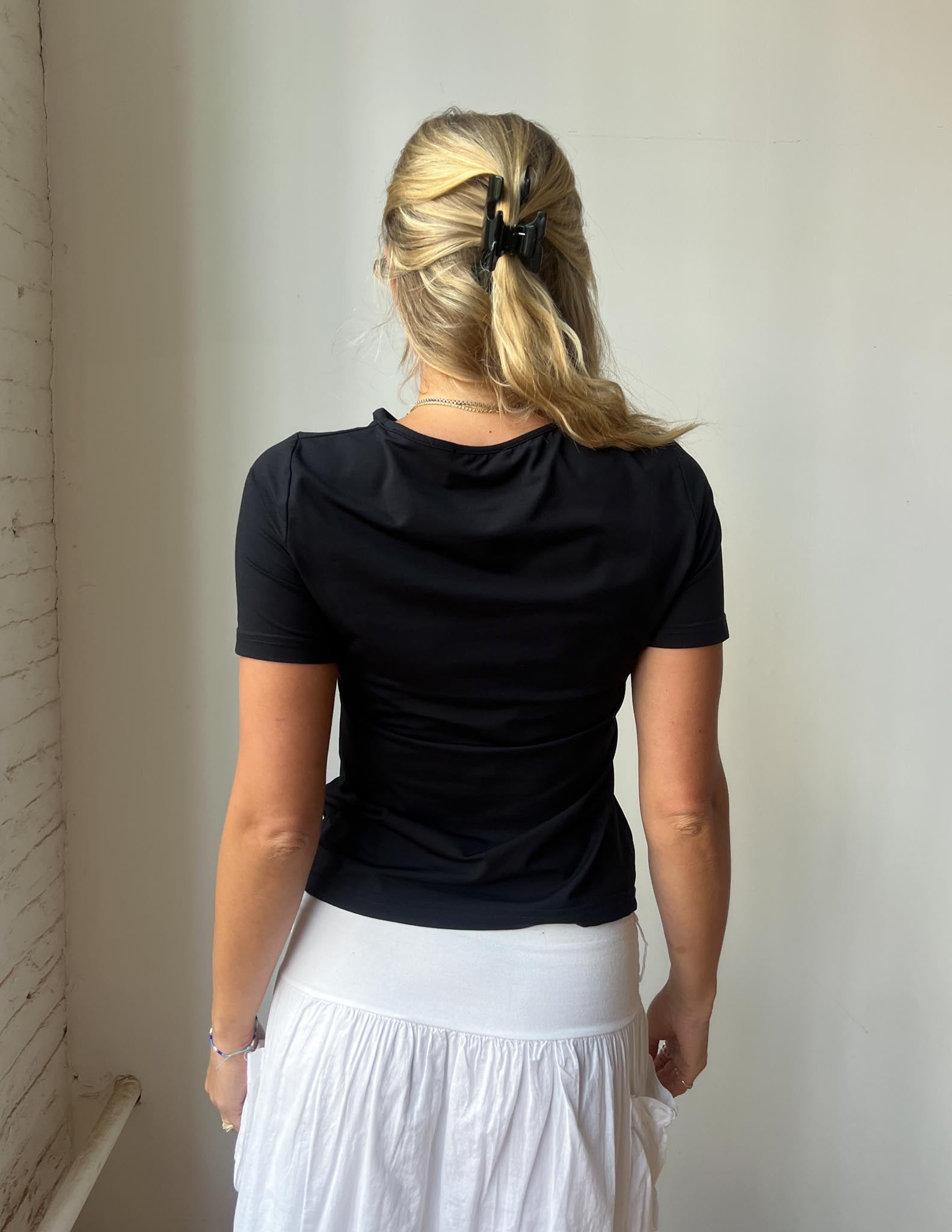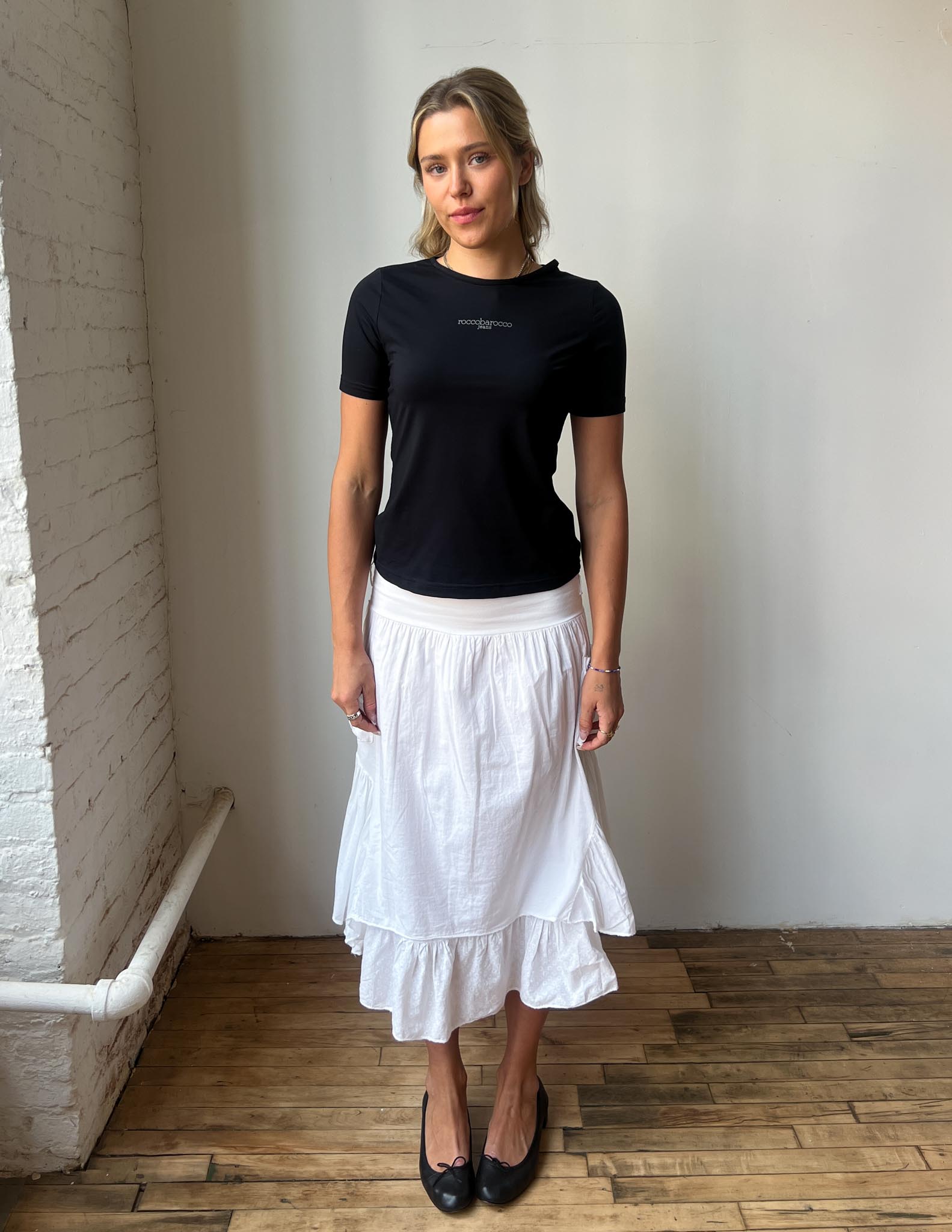 Natalia is wearing a Roccobarocco Jeans Tee. This top would be best fit for size S/M.